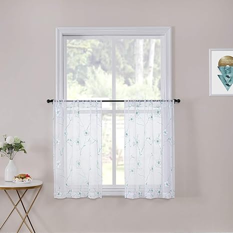 Amazon Com Tollpiz Flower Short Sheer Tier Curtains Aqua Blue White Blossom Embroidery Half Kitchen Curtain Rod Pocket Voile Embroidered Floral Curtains For Bathroom 30 X 24 Inches Long Set Of 2 Panels